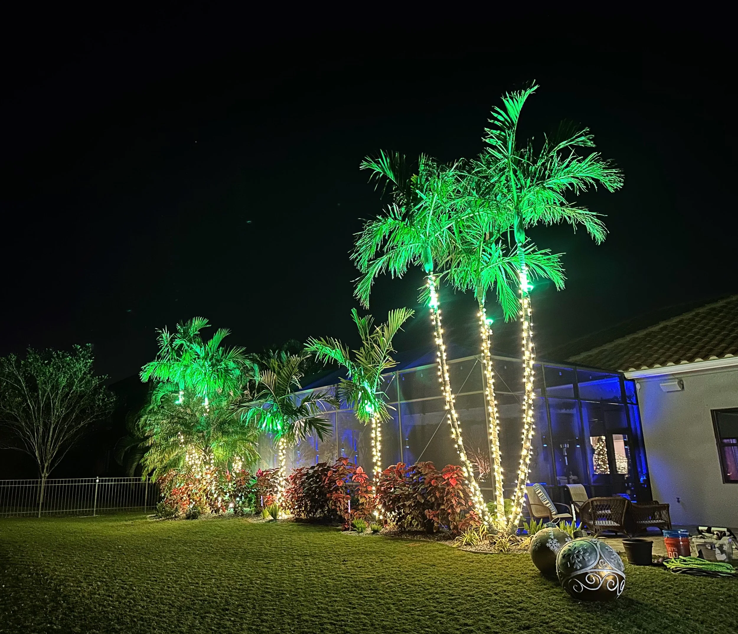 Want to take your holiday display to the next level? Try adding uplights at the base of your palm trees. Uplighting creates a dramatic, resort-style effect, making your palms glow from the ground up.